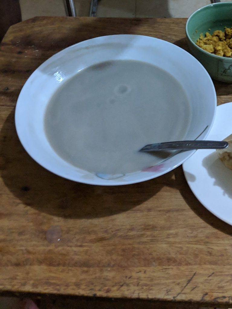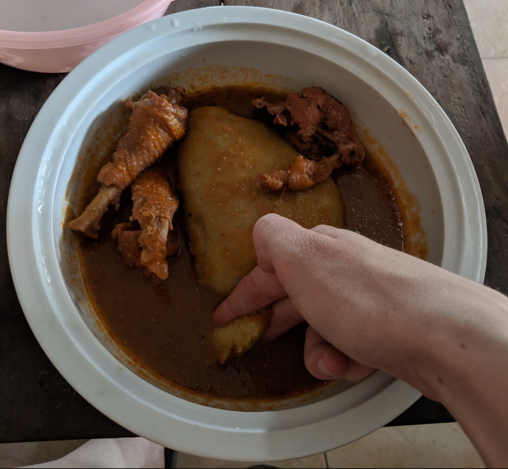 Wenn man in einen richtigen ghanaischen Haushalt geht, darf natürlich Fufu nicht fehlen. Es ist ein Hauptgericht, welches die Ghanaer lieben. Meine Schwiegermutter meinte einmal sogar: „Wenn ich an einem Tag nicht Fufu esse, fühlt es sich an, als ob etwas fehlt.“ Dabei muss gesagt werden; meine Schwiegermutter ist eine der Ghanaerinnen, welche wirklich sehr Fufu-verliebt ist. Fast noch mehr, wie mein Vater Raclette liebte. Es besteht aus gekochten Kochbananen (Plantain) und Casava/Maniok oder auch Cocoyam, welche zu einer – wenn ich es beschreiben müsste – teigartigen Masse gestampft werden, die man anschliessend zusammen mit einer Suppe (z.B. Lightsoup) isst. Dieses Gericht ist natürlich nicht schnell gemacht, es braucht viel Zeit und Kraft. Im Allgemeinen braucht ghanaisches Essen oftmals sehr viel Zeitaufwand. (Hierzu werde ich bestimmt auch noch einen Artikel machen.) Fufu! Wir liebten es alle (ausser Silas) – der ist immer noch auf Diät. Keine Sorge, er musste nicht hungern, ich habe für ihn improvisiert.