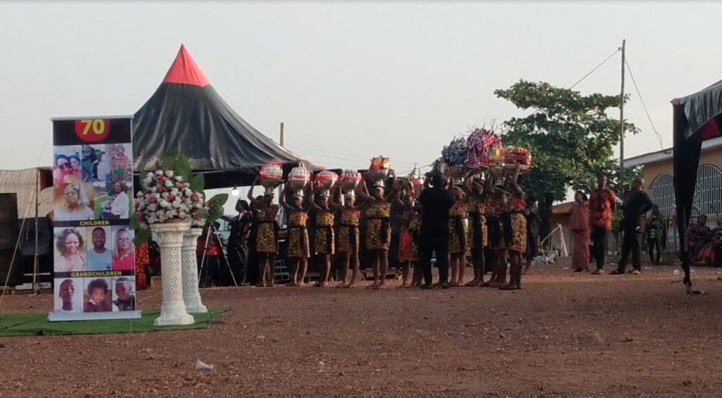 Die Zeremonie wird von einer Live-Band begleitet und irgendwann kamen auch die Geschenke, welche von mir und meinem Schwager (Der Mann von Isaac’s Schwester – man nennt uns hier die In-Laws) auf dem Kopf von mehreren Mädchen präsentiert wurden. Die Geschenke wurden von einer Frau am Mikrofon ziemlich ins Detail aufgezählt, was wir unseren Ehegatten alles zur Beerdigung ihrer Mutter schenken. Und danach spielte wieder Musik. So stand Isaac zusammen mit seiner Schwester auf und tanzte vor allen. Irgendwie speziell, Isaac mittendrin zu beobachten. Isaac der genau so gerne im Mittelpunkt steht wie ich. Immer wieder setzte ich mich entweder hinter oder neben ihn und nahm irgendwie nebenan am Fest teil. Mehr im Beobachter und „hoffentlich mache ich alles richtig“ Modus. Was genau von mir erwartet wird? Keine Ahnung. Was ich genau machen soll? Keine Ahnung. So liefen ich und die Kids zwischen Haus, Zimmer und Dorfplatz immer wieder hin und her. Und wie ging es den Kids dabei? Naja, wenn Skyah „mole“ (malen) sagte, dann meinte sie nicht mit Stift und Blatt, sondern sie wollte auf dem Natel „malen“ resp. gamen. Auch das kann man ja wieder abgewöhnen, dachte ich mir. Ich wollte es mir in diesen Momenten einfach so einfach wie möglich machen und liess sie dann halt „Gamen“.