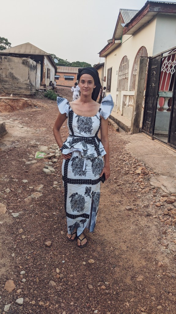 Am Sonntag, der letzte Tag der dreitägigen Beerdigung meiner Schwiegermutter gingen wir als Erstes zum Morgenessen. Es gab gebratene Eier, Milo (Schokoladen“Milch“, man richtet das Schokoladenpulver zusammen mit heissem Wasser und Kondensmilch an) und Brot. Dieses Frühstück war mein Lieblingsfrühstück. Simpel aber lecker. Anschliessend machten wir uns zurück zum Haus von Mr. Hagan und zogen unser letztes Outfit für den letzten Tag der Beerdigung an. Diesmal war es ein schwarz/weisses Kleid und wieder eine andere Form. An Sonntagen trägt man an Beerdigungen nach Ashanti Tradition immer schwarz/weiss. Isaac trug wieder ein schwarz/weisses Tuch um seinen Oberkörper und darunter eine weisse Hose. Nachdem wir alle gekleidet waren, machten wir uns auf den Weg zur Kirche. Am Sonntag gehen die Ghanaer jeweils zum Gottesdienst, auch an Beerdigungswochenenden wie diesem.